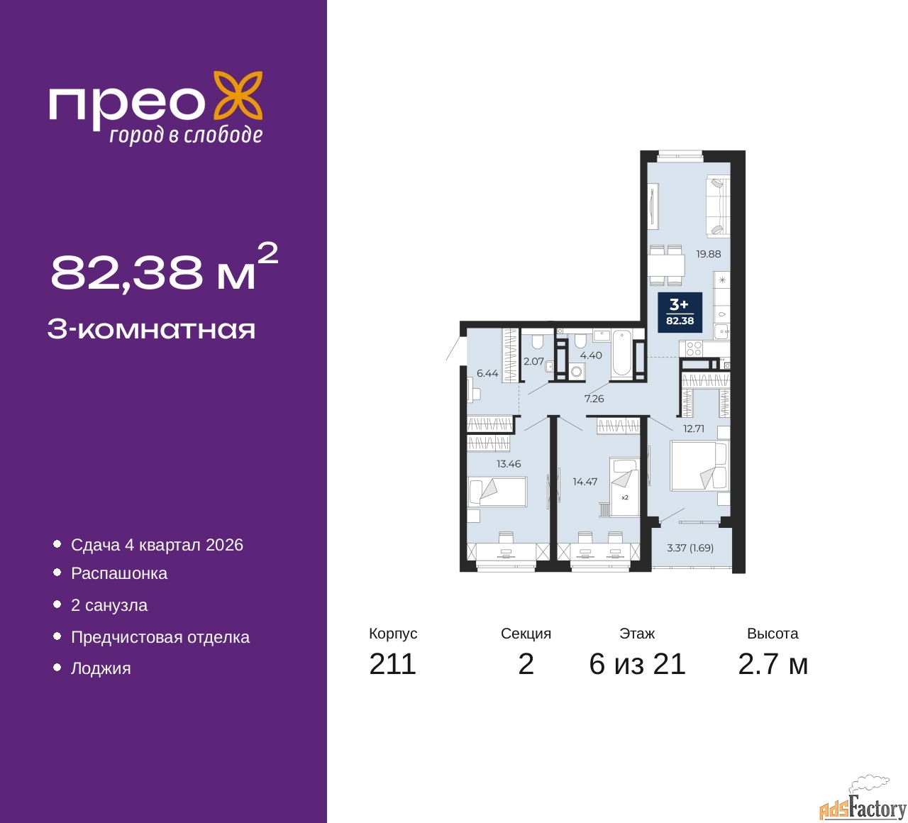 Дом монолитный, черырехподъездный, переменной этажности, от 14 до 21 этажей. Квартира находится во 2-й секции высотой 21 этаж в корпусе 211. На этаже 10 квартир. В подъезде 1 пассажирский и 1 грузовой лифт. Окончание строительства - 4 квартал 2026 года. Оформление сделки по договору долевого участия.