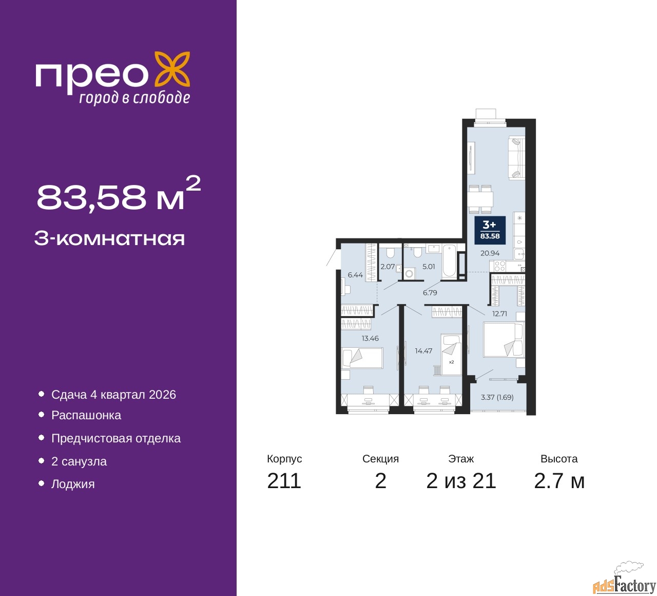 Дом монолитный, черырехподъездный, переменной этажности, от 14 до 21 этажей. Квартира находится во 2-й секции высотой 21 этаж в корпусе 211. На этаже 10 квартир. В подъезде 1 пассажирский и 1 грузовой лифт. Окончание строительства - 4 квартал 2026 года. Оформление сделки по договору долевого участия.