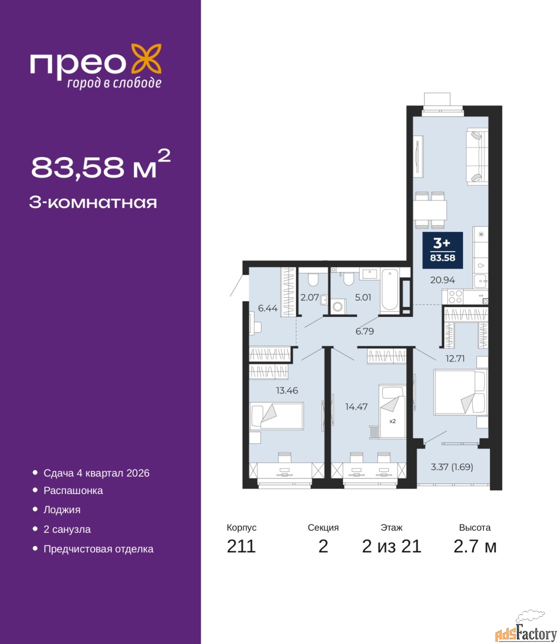 | Общая площадь (кв.м) | 83.58 |