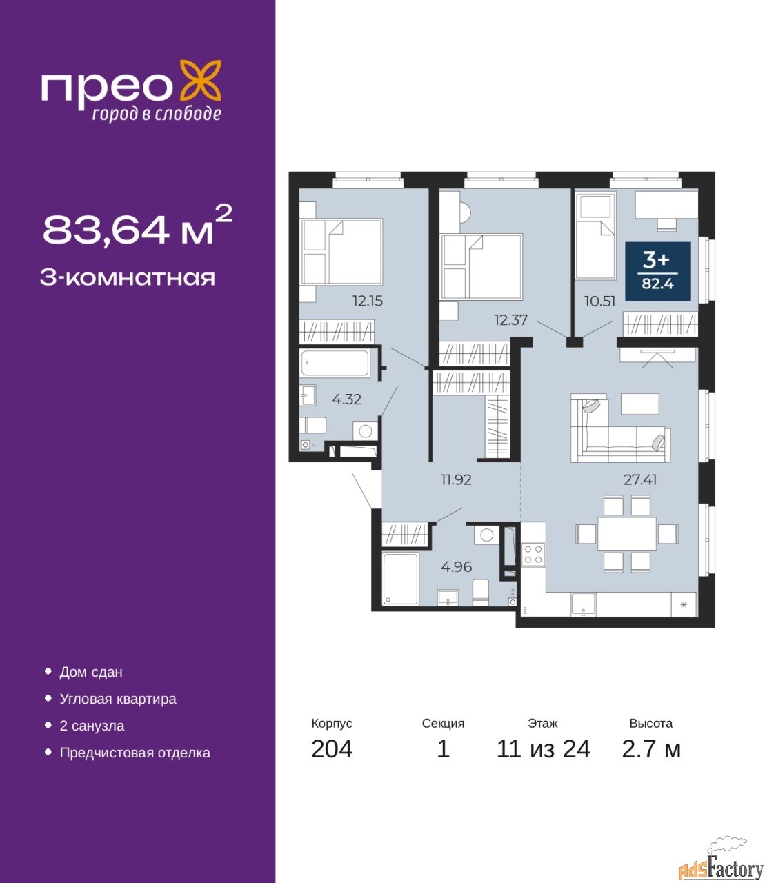 Квартира находится в корпусе 204. Дом монолитный, одноподъездный, высотой 24 этажа. На этаже 14 квартир. В подъезде 2 грузовых лифта. На сегодняшний день строительство завершено, дом сдан в 4 квартале 2024 года. Оформление сделки по договору купли-продажи.