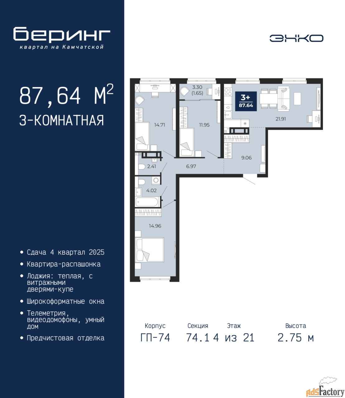 Дом монолитный, многоподъездный, переменной этажности, от 9 до 21 этажей. Квартира находится в 74.1-й секции высотой 21 этаж в корпусе ГП-74. На этаже 5 квартир. В подъезде 1 грузовой лифт. Окончание строительства - 1 квартал 2026 года. Оформление сделки по договору долевого участия.