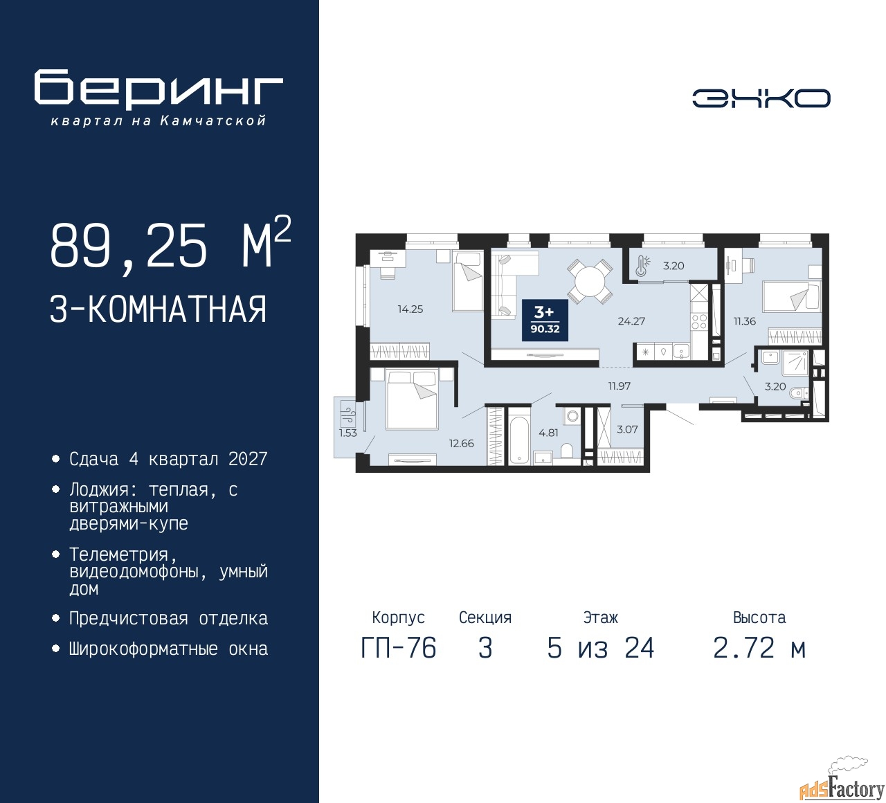 Дом монолитный, черырехподъездный, переменной этажности, от 19 до 24 этажей. Квартира находится в 3-й секции высотой 24 этажа в корпусе ГП-76. На этаже 6 квартир. В подъезде 1 пассажирский и 1 грузовой лифт. Окончание строительства - 4 квартал 2027 года. Оформление сделки по договору долевого участия.