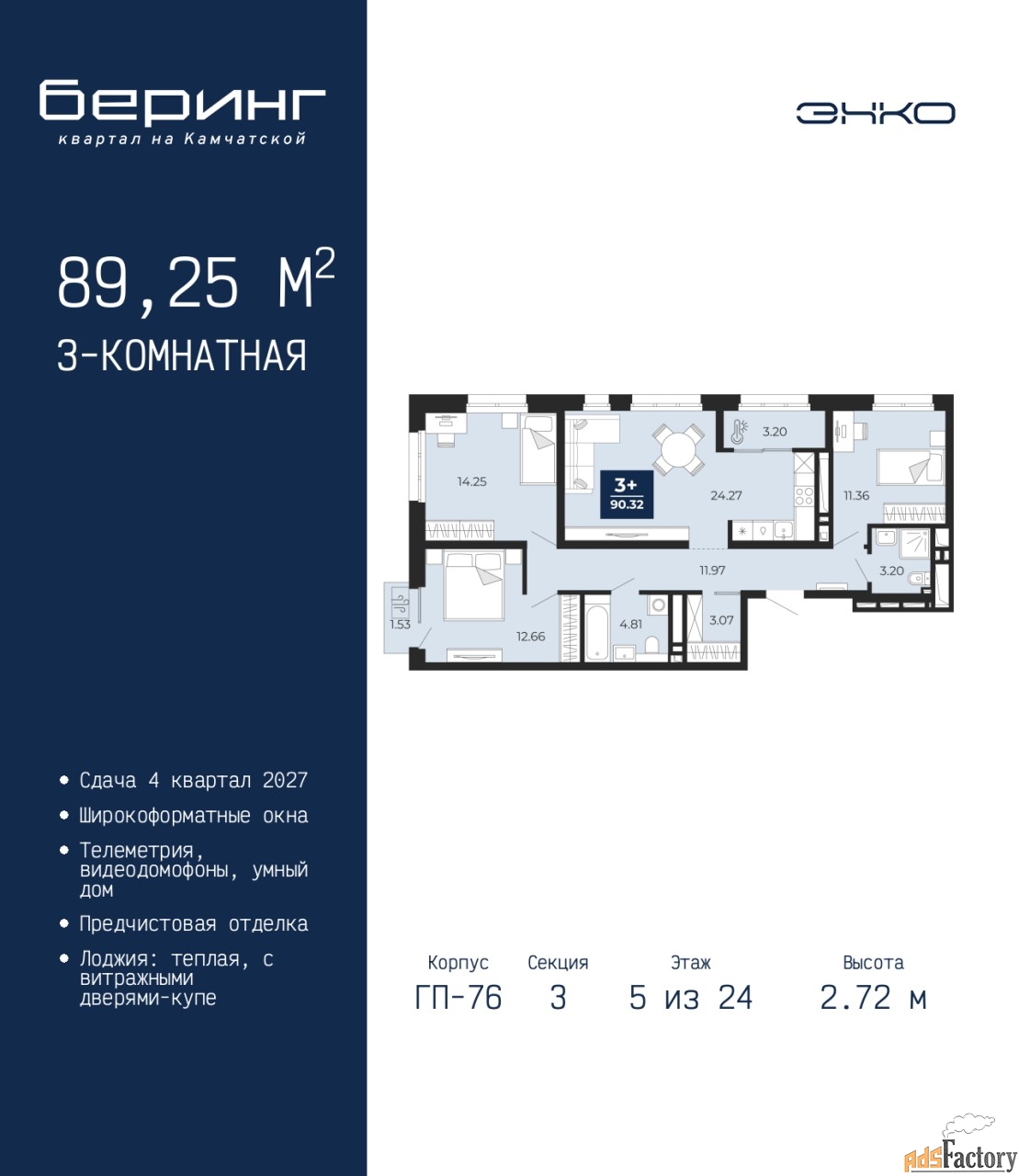 Дом монолитный, черырехподъездный, переменной этажности, от 19 до 24 этажей. Квартира находится в 3-й секции высотой 24 этажа в корпусе ГП-76. На этаже 6 квартир. В подъезде 1 пассажирский и 1 грузовой лифт. Окончание строительства - 4 квартал 2027 года. Оформление сделки по договору долевого участия.