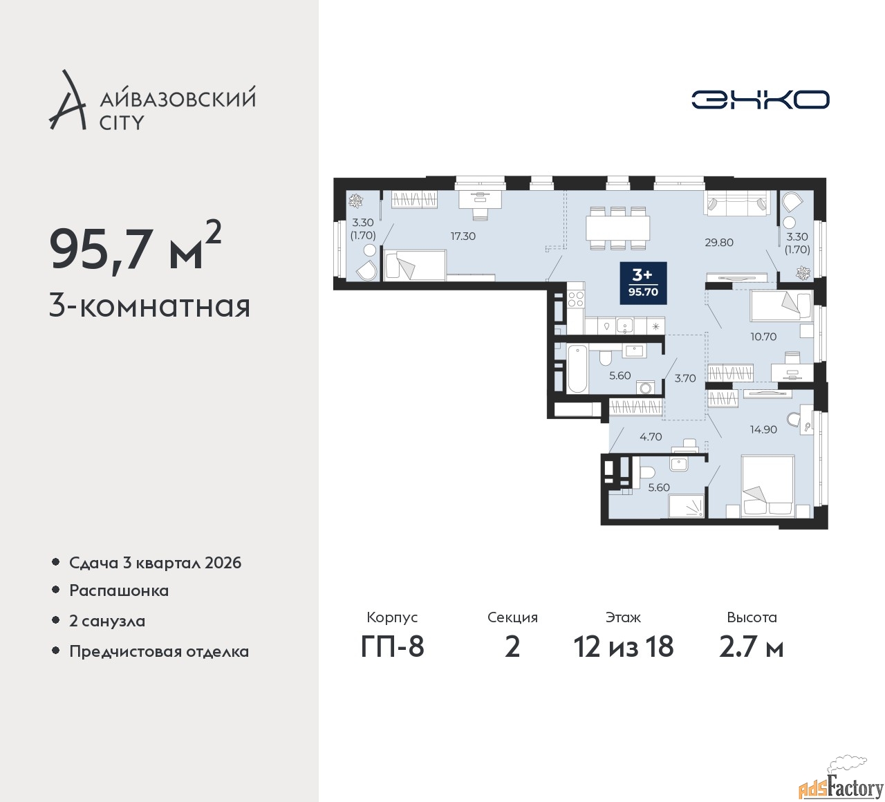 Дом монолитный, многоподъездный, переменной этажности, от 14 до 24 этажей. Квартира находится во 2-й секции высотой 18 этажей в корпусе ГП-8. На этаже 5 квартир. В подъезде 1 пассажирский и 1 грузовой лифт. Окончание строительства - 3 квартал 2026 года. Оформление сделки по договору долевого участия.