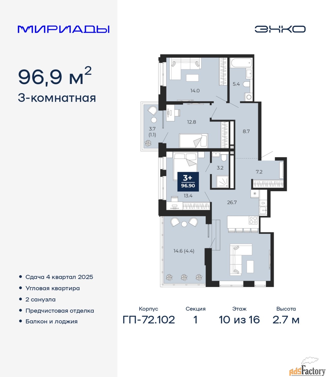 Дом монолитный, многоподъездный, переменной этажности, от 14 до 16 этажей. Квартира находится в 1-й секции высотой 16 этажей в корпусе ГП-72.102. На этаже 9 квартир. В подъезде 1 пассажирский и 1 грузовой лифт. Окончание строительства - 4 квартал 2025 года. Оформление сделки по договору долевого участия.