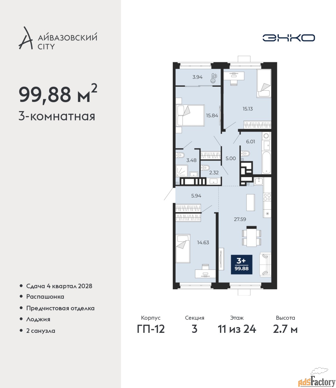 Дом монолитный, многоподъездный, высотой 24 этажа. Квартира находится в 3-й секции в корпусе ГП-12. На этаже 6 квартир. В подъезде 1 пассажирский и 1 грузовой лифт. Окончание строительства - 4 квартал 2028 года. Оформление сделки по договору долевого участия.