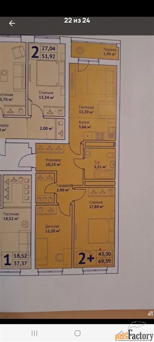 Так же имеется хорошее и сухое подвальное помещение 5м2.(продается отдельно, по запросу). Так же обращаю внимание что данная планировка квартиры (распашонка, где окна выходят на улицу и во двор) ОДНА (уникальна) НА ЭТАЖЕ и во всем доме (на все три подъезда), т.е. их всего 24. Я собственник (не агенство), продажа в связи с переездом в другой регион. Квартира в собственности с начала строительства по договору долевого участия. Никаких обременений нет, готовы к сделке.