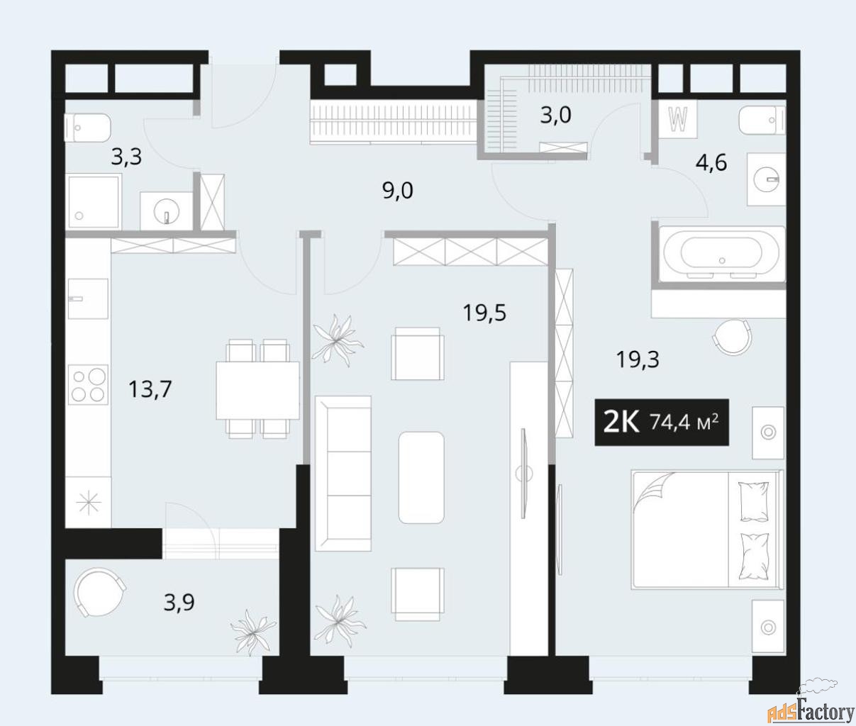 Идеальная планировка: Возможность создать евро-формат с двумя изолированными санузлами. Просторная кухня-гостиная станет центром притяжения, а уединенная мастер-спальня с собственной ванной комнатой — местом для отдыха. Витражное остекление на лоджии и высокие потолки создают ощущение простора и наполняют пространство светом.