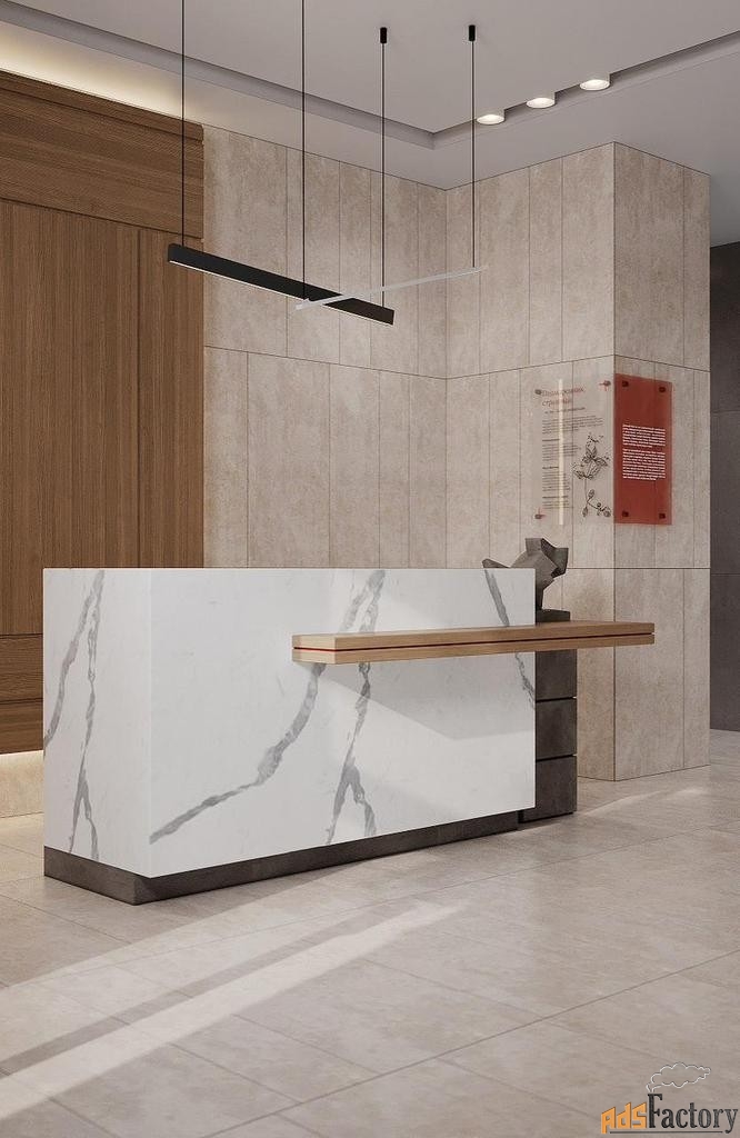 Фасад и инфраструктура: Фасад отделан стильной клинкерной плиткой с панорамным остеклением. Входная группа впечатляет лобби со вторым светом и круглосуточным консьерж-сервисом.
