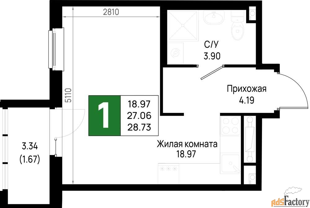 Жилая площадь 18.97 м2, черновая отделка, комнаты изолированные.