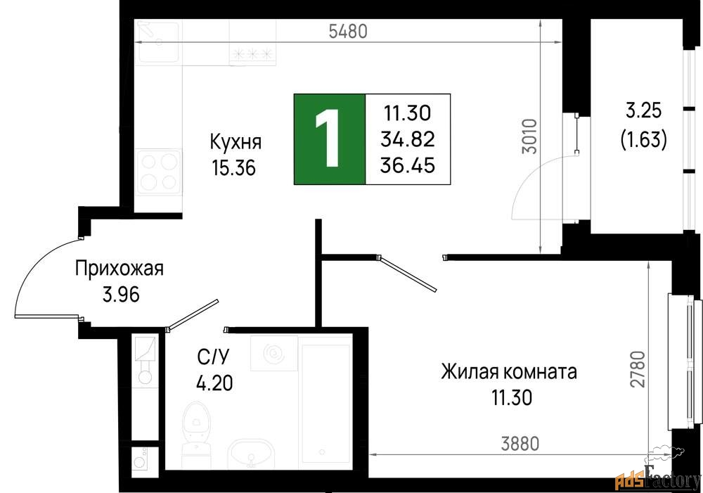Жилая площадь 11.3 м2, кухня 15.36 м2, черновая отделка, комнаты изолированные.