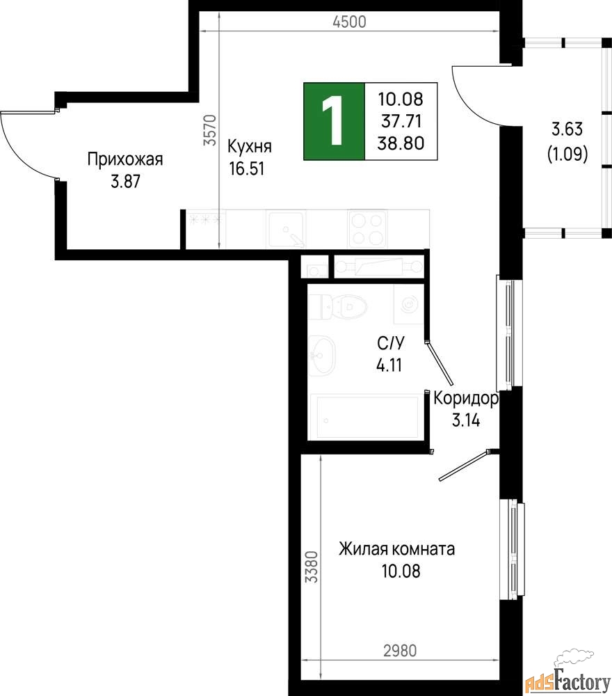 Жилая площадь 10.08 м2, кухня 16.51 м2, черновая отделка, комнаты изолированные.