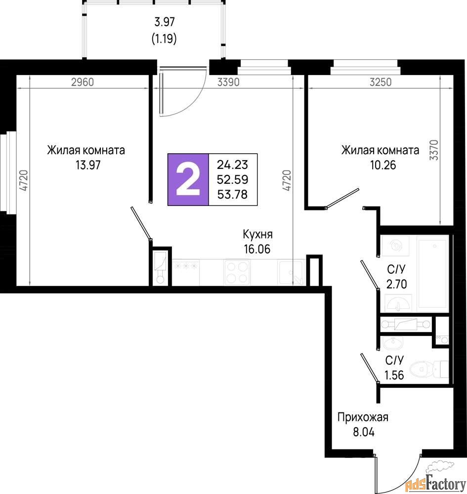 Жилая площадь 24.23 м2, кухня 16.06 м2, черновая отделка.