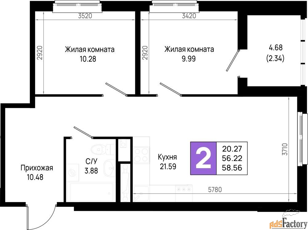 Жилая площадь 20.27 м2, кухня 21.59 м2, черновая отделка.