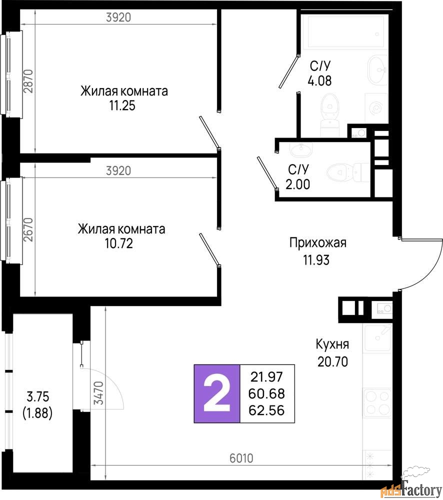 Жилая площадь 21.97 м2, кухня 20.7 м2, черновая отделка.