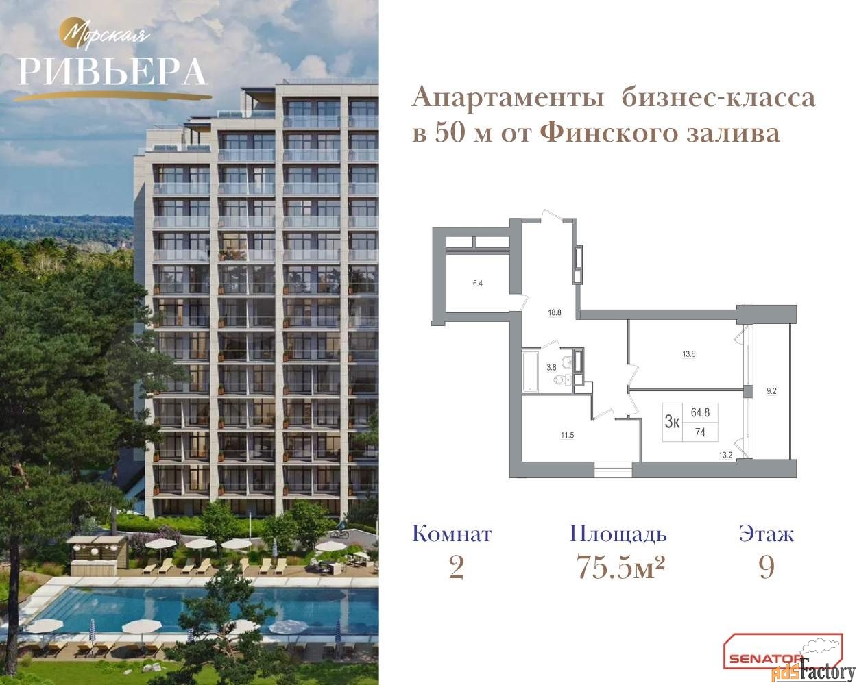 В комплексе всего 13 этажей. Из окон открывается завораживающий вид на Финский залив и многовековой лесной массив.