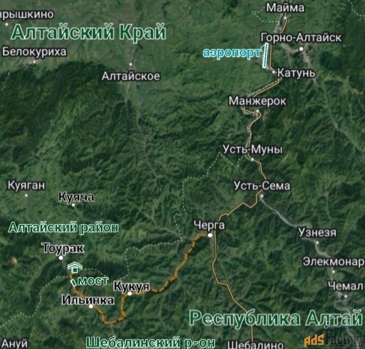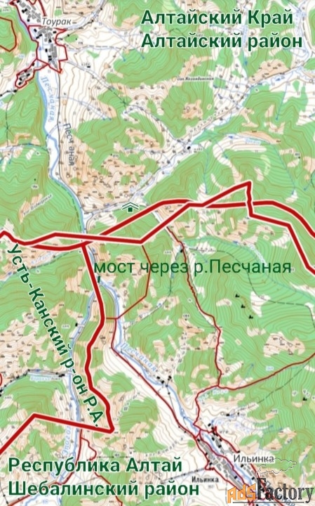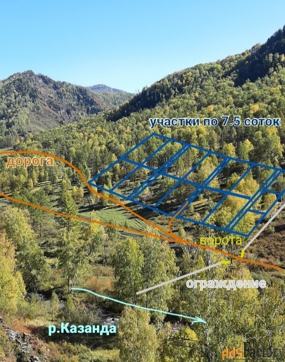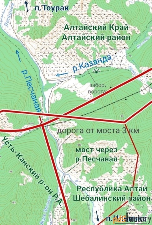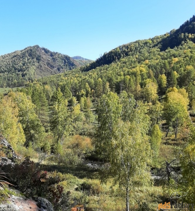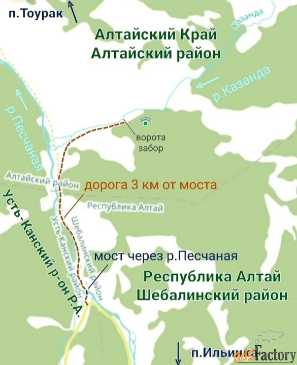 Участок 7.5 сот на Алтае в горах у речки в дали от цивилизации, земли рекреации в собственности, располагается на возвышенности между гор в видовом красивом месте в 70-ти метрах от берега мелкой горной речки Казанда. Рядом расположены два мараловодческих комплекса (возможна покупка у них концентрата для пантовых ванн). В 20-ти км от участка район охоты на косулю, подальше в 40-ка км на медведя, рыбалка на хариуса (таймешонка) рядом в 1-ом км на р.Песчаной. Возможно под горную хижину в стиле фахверк. Рельеф территории с не большим уклоном не более 15-ти градусов. Расположен в административных границах Куячинского сельсовета в урочище Казанда в Алтайском районе А.К., в 6-ти км от п.Тоурак. В 10-ти км от п.Ильинка Шебалинского района Р.А. Подъезд со стороны аэропорта Горно-Алтайска (120 км до участка) мимо Манжерока в п.Усть-Сема через мост по чуйскому тракту, далее в п.Черга со своротом в право через населённый пункт с направлением на Усть-Кан по асфальту. Не доезжая 40 км до места дорога идёт по хорошо укатанной дороге из песчано-гравийной смеси с щебнем через перевал, и далее так же со своротом в право в сторону Ильинки (Мариинск). Далее через п.Ильинка, и от него (от окраины район ДРСУ) не менее 6-ти км далее в право через мост и через реку Песчаная в сторону Алтайского Края Алтайского раона, после моста 3 км до места. Со временем, необходимы работы: