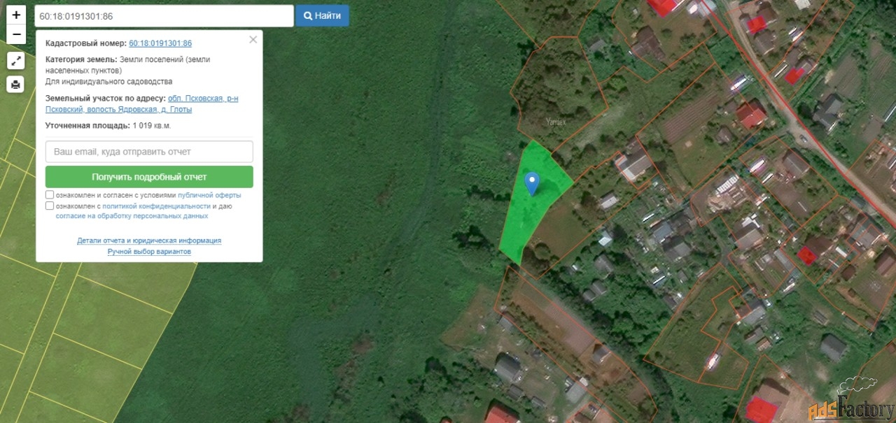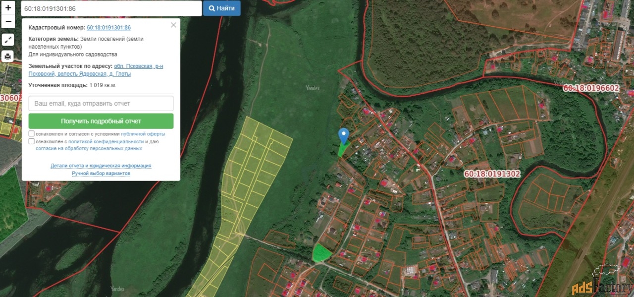 ?. Кадастр 60:18:0191301:86 (земли населённых пунктов, разрешено ИЖС и садоводство)