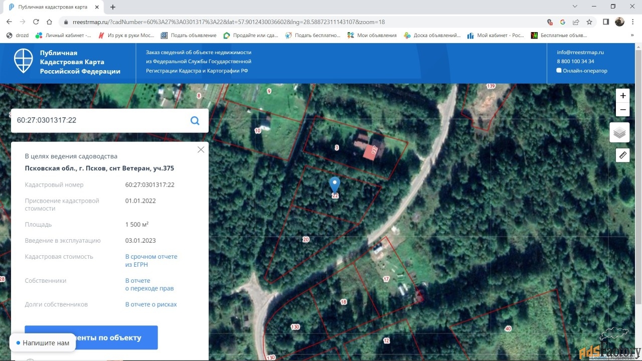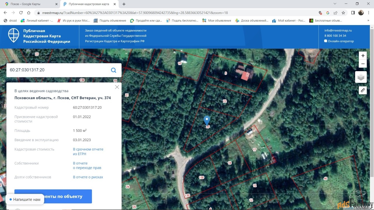 УЧАСТОК 30 СОТОК В ХВОЙНО БЕРЁЗОВОЙ РОЩЕ ПОД ПСКОВОМ В СНТ "ВЕТЕРАН". К продаже предлагаю интересный, крайне выгодно и удобно расположенный земельный участок в уютной хвойно-березовой роще с отличной транспортной доступностью в одном из лучших садовых товариществ Псковского района, в редко застроенном центре, в лесистой части СНТ Ветеран, удаленностью от черты г. Пскова 14 км. Участок площадью 30 соток разрешенного использования "для садоводства", расположен ровно в полутора километрах от Ленинградского шоссе, по ровной асфальтированной дороге, состоит их двух равнозначных по площади участков №374 и №375 соответственно с кад. номерами 60:27:0301317:20 и 60:27:0301317:22, имеющих между собой общую границу и составляющих единое целое. Электричество к участку, отличный асфальтовый круглогодичный подъезд, один сосед, тишина и спокойствие, совсем рядом, около 100 м. автобусная остановка, до реки Псковы 500-600 м. Участок прекрасно подходит как для строительства дачного так и для полноценного жилого дома, в последствии возможна прописка. Все документы готовы, прямая продажа от собственника. ИМЕЕТСЯ ВЫБОР ЗЕМЕЛЬНЫХ УЧАСТКОВ В ТОМ ЧИСЛЕ КРУПНЫХ СЕЛЬХОЗНАЗНАЧЕНИЯ И ХУТОРНОГО ТИПА.