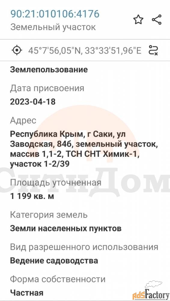 https://www.adsfactory.ru/nedvizhimost/zemelnye-uchastki/saki-uchastok-1199-sot-sadovodstvo-BLD-1093271763704985367