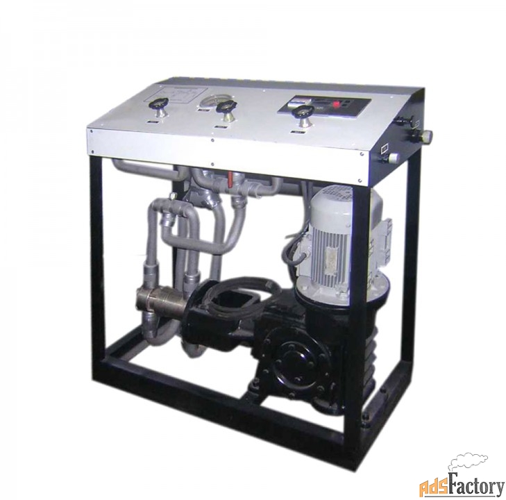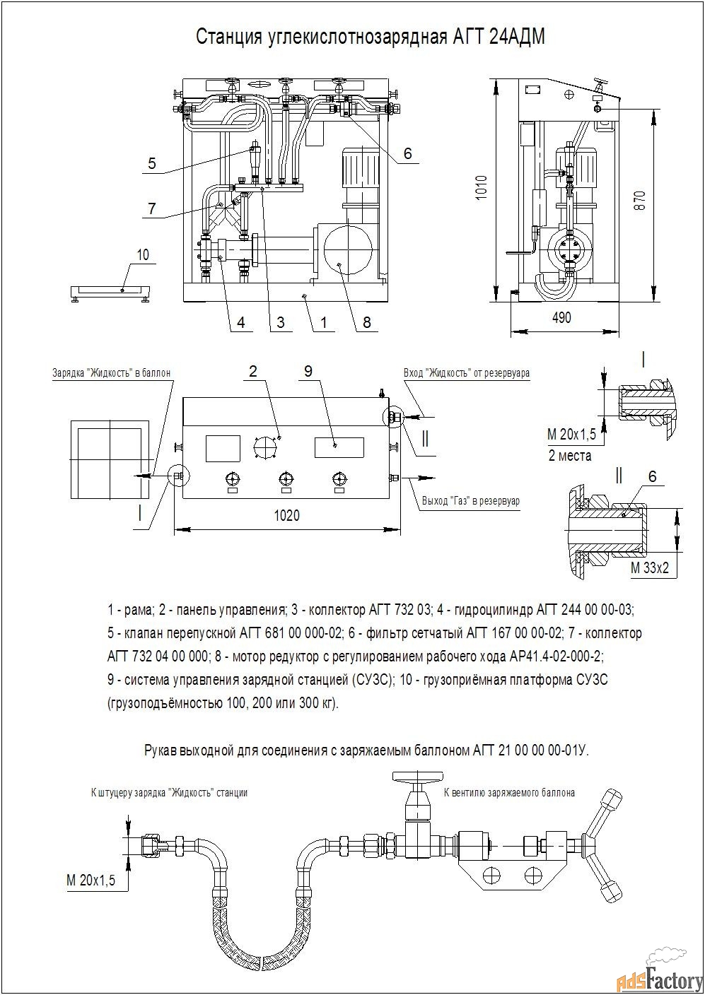 Станция углекислотнозарядная АГТ 24АДМ предназначена для наполнения баллонов и огнетушителей низкотемпературной жидкой двуокисью углерода по ГОСТ 8050 из сосуда для её хранения, с дозированием по массе заряжаемой углекислоты, а также для дозированной подачи жидкой СО2 в технологическую линию. Агрегаты станции углекислотнозарядной смонтированы на стальной сварной раме. Низкотемпературная жидкая двуокись углерода перекачивается из сосуда для её хранения в баллон или огнетушитель или в технологическую линию плунжерным насосом двойного действия. Приводом насоса является одноступенчатый мотор-редуктор, состоящий из электродвигателя и редуктора червячного. Редуктор преобразует вращающий момент электродвигателя в возвратно-поступательное движение ползуна, с которым соединен плунжер насоса.