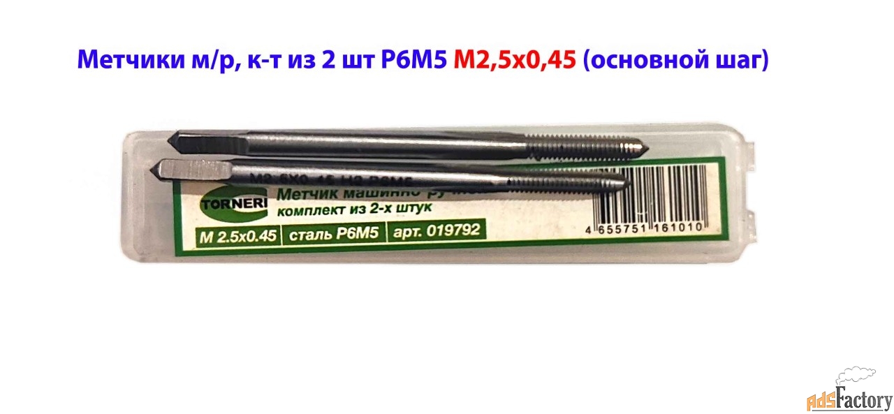 У нас Вы можете приобрести метчики (от М-2 до М-52) м/р комплектные (№1 и №2) из стали Р6М5, ручные парные (№1 и №2) из углеродистой стали, метчики машинные (для сквозной или глухой резьбы) из Р6М5, метчики гаечные (прямой и изогнутый хвостовик) , а также метчики для нарезания трубной и конической резьбы (от 1/8 до 2 дюймов) из стали Р6М5 или углеродистой стали, со склада и под заказ.