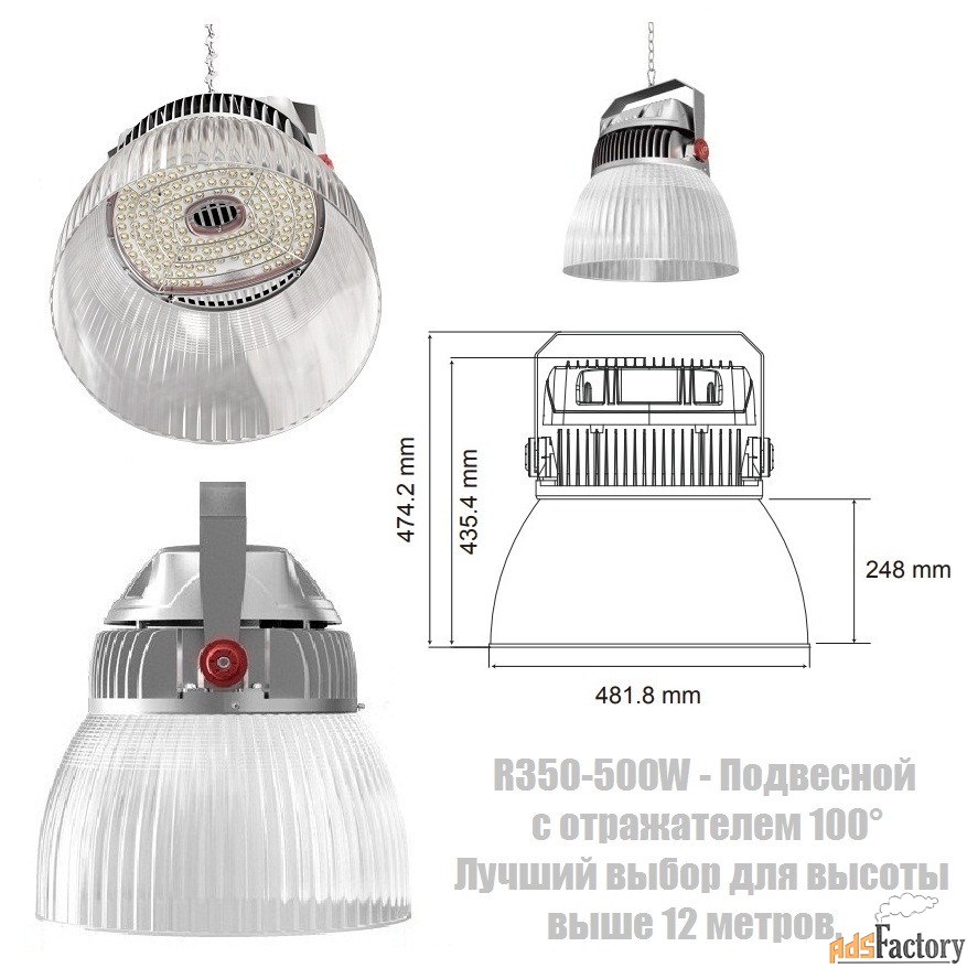 Светодиодный промышленный подвесной светильник R350-500W мощностью 500 Вт, выполняет функцию замены подвесных светильников с металлогалогенными лампами мощностью до 1000 Вт. При этом экономия электроэнергии достигает 50%, срок службы возрастает более чем в 3 раза. Помимо общих преимуществ светодиодных светильников (мгновенное включение, низкие пульсации светового потока, отсутствие ртути, возможность диммирования, устойчивость к перепадам напряжения), благодаря особенностям конструкции светильник R350 тип подвесной отличает высокая прочность, удобство монтажа и обслуживания.