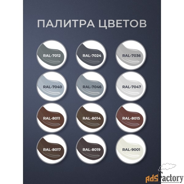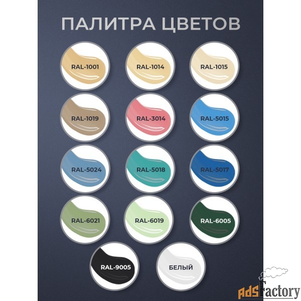 отвечает всем современным требованиям.Широкий ассортимент цветов: Белый, RAL 1001 (Бежевый), RAL 1014 (Слоновая кость), RAL 1015 (Светлая слоновая кость), RAL 1019 (Серо-Бежевый), RAL 5018 (Бирюзово-Синий), RAL 5024 (Пастельно-Синий), RAL 6019 (Бело-Зелёный), RAL 6021 (Бледно-Зелёный), RAL 7012 (Базальтово-Серый), RAL 7024 (Графитовый серый), RAL 7036 (Платиново-Серый), RAL 7040 (Серый), RAL 7046 (Тёмный серый), RAL 7047 ( Светло-Серый), RAL 8011 (Орехово-коричневый), RAL 8015 (Каштаново-Коричневый), RAL 8017 (Шоколадно-Коричневый), RAL 8019 (Серо-Коричневый), RAL 5015 (Небесно-Синий), RAL 5017 (Транспортный синий), RAL 9005 (Глубокий чёрный), RAL 3014 (Тёмно-Розовый), RAL 8014 (Сепия-Коричневый), RAL 6005 (Зелёный мох), RAL 9001 (Кремово-Белый)